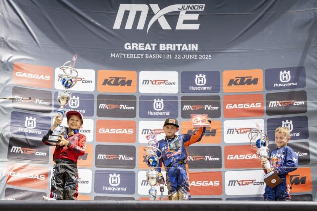 MATTERLEY BASIN (Gran Bretagna), 22 giugno 2025 – Con una prestazione impeccabile davanti al pubblico di casa, Austin Senior ha dominato la terza prova della Junior e-Motocross Series 2025, disputata sul celebre tracciato di Matterley Basin, in concomitanza con il MXGP di Gran Bretagna. Dopo una combattuta vittoria in Gara 1 e una cavalcata trionfale in Gara 2, il giovane talento britannico è tornato sul gradino più alto del podio, riconquistando la red plate di leader della classifica generale a due round dalla fine.