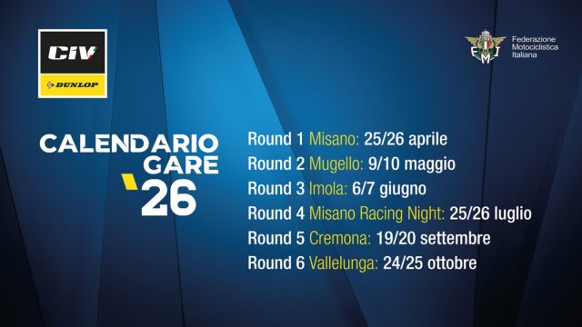 Il calendario del CIV Junior 2026 prevede cinque appuntamenti, con partenza il 24 maggio a Magione e gran finale il 27 settembre a Varano. Spettacolo assicurato grazie al ritorno della Superpole Race, presente in tutti gli eventi tranne quello di Viterbo (2 agosto), dove andrà in scena la Sprint Race. Da segnalare inoltre il round della GP Junior a Cremona il 19 luglio, in concomitanza con la Coppa Italia.