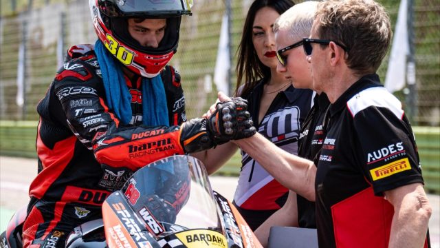 La quinta vittoria consecutiva di Michele Pirro sfuma a tre curve dalla fine. Dopo la schiacciante affermazione in gara-1, il pilota del Barni Spark Racing Team è sempre stato in testa anche in gara-2, ma quando tutto sembrava pronto per la doppietta è arrivato l’episodio che ha cambiato il finale. Luca Bernardi (Aprilia) è riuscito a restare attaccato al leader per tutta la durata della gara e all’ultimo giro ha portato l’attacco al “tornantino”; alla curva successiva Pirro ha perso l’anteriore ed è finito a terra. Questo “zero” costa al #1 anche la leadership del campionato che torna nelle mani di Zanetti salito a 117 punti contro i 109 di Pirro. Continua invece il percorso di crescita di Alberto Butti che in una gara con tante cadute è riuscito a portare a casa il suo miglior risultato stagionale conquistando il quinto posto.