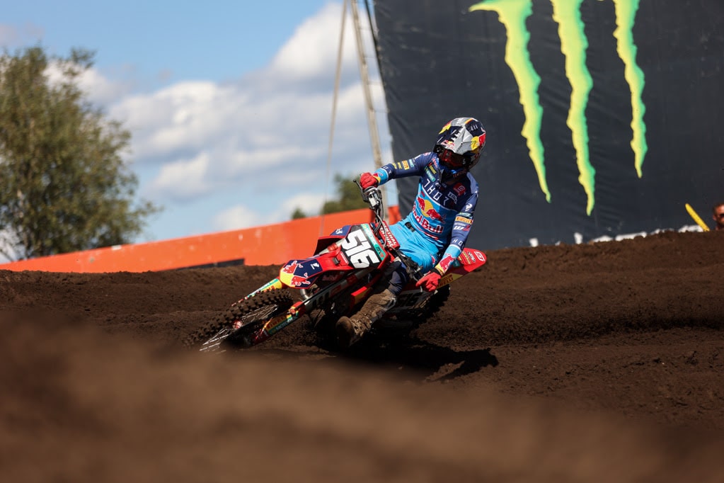 In classe MX2, il solido e costante Liam Everts (Red Bull KTM Factory Racing) ha vinto il suo secondo Gran Premio della stagione in un ultimo giro emozionante che ha visto Lucas Coenen (Nestaan Husqvarna Factory Racing) finire secondo assoluto grazie alla sua vittoria in gara due e allo spirito combattivo nella prima gara. Simon Laengenfelder (Red Bull GasGas Factory Racing) ha completato il podio con un’altra vittoria per mantenere la sua serie di podi. Sfiora il podio Jaco Geerts BEL, Yamaha) finendo quarto davanti ad Andrea Adamo (Red Bull KTM Factory Racing) che grazie a un secondo e un quinto di manche si mantiene ancora al comando con 72 punti di vantaggio sul compagno Everts.