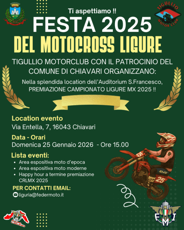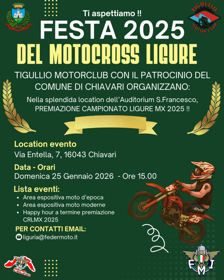 Il Motoclub Tigullio Motorclub, in collaborazione con il Comune di Chiavari e con il supporto del Comitato Regionale FMI Liguria, organizza la Festa del Motocross Ligure 2025, appuntamento dedicato alla celebrazione del Campionato Regionale Ligure MX 2025.