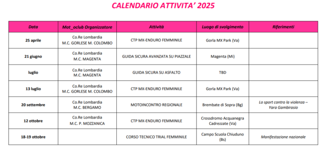 La Commissione Femminile del Comitato Regionale Lombardia FMI ha ufficializzato il calendario regionale Fuoristrada aggiornato per la stagione 2025, confermando sette appuntamenti dedicati alla crescita e alla promozione del motociclismo femminile nella regione.
