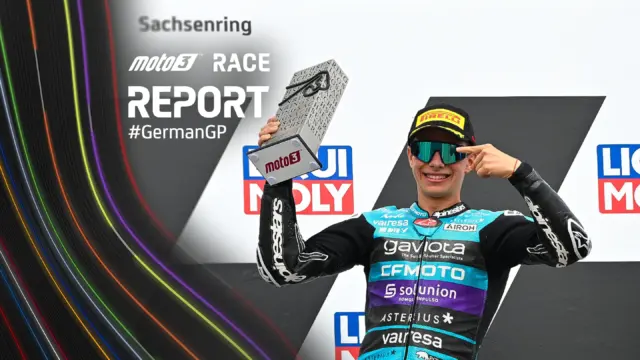 Al Liqui Moly Motorrad Grand Prix Deutschland, David Alonso del team CFMOTO Gaviota Aspar è tornato sul gradino più alto del podio dopo una domenica drammatica. Il colombiano ha vinto con un margine di soli 0.187 secondi su Taiyo Furusato (Honda Team Asia), che ha conquistato il secondo posto dopo essere partito dall’ottava posizione in griglia, mostrando un ritmo costante per tutta la gara. Ivan Ortola (MT Helmets – MSI), nonostante fosse partito dalla dodicesima posizione e avesse scontato una Long Lap Penalty, ha compiuto una straordinaria rimonta, chiudendo al terzo posto con il giro più veloce della gara.
