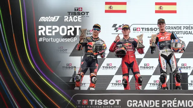 Daniel Holgado (Red Bull GASGAS Tech3) si conferma vincitore in grande stile al GP del Portogallo dopo un duello mozzafiato sull’ultimo giro. Jose Antonio Rueda della Red Bull KTM Ajo ha condotto in modo convincente nelle fasi iniziali, ma alla fine è arrivato secondo per soli 0,044 secondi. A completare il podio c’è stato Ivan Ortola (MT Helmets – MSI), che ha impressionato il pubblico con una guida intelligente che lo ha portato sul podio.