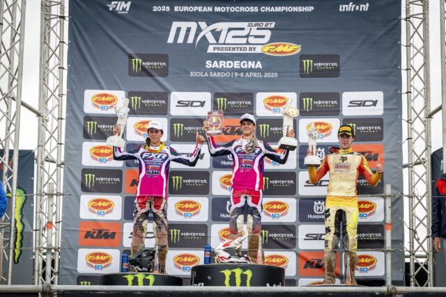 Riola Sardo (Sardegna), 6 aprile 2025 – Terzo appuntamento stagionale e prima vera prova nel deserto per i giovani talenti dell’EMX125 Presented by FMF Racing: il tracciato sabbioso di Riola Sardo ha messo alla prova tecnica, resistenza e sangue freddo. E tra tutti, a brillare è stato Áron Katona. Il giovane ungherese del team Racestore KTM Factory Rookies ha firmato una straordinaria doppietta, diventando il primo pilota della stagione a vincere tre manche consecutive. Con questa prestazione, Katona si prende anche la tabella rossa di leader del campionato.