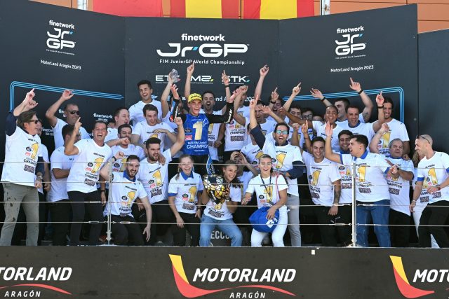 L’azione era ovunque guardassi in un epico round di gare del Finetwork FIM JuniorGP World Championship 2023, l’evento penultimo dell’anno. Le temperature erano alte e l’azione in pista ancora più intensa, con Angel Piqueras (Team Estrella Galicia 0,0) che è diventato l’ultimo nome a essere incoronato campione nella classe JuniorGP. Per quanto riguarda il Moto2 European Championship, è stato Senna Agius (Liqui Moly Husqvarna Intact GP Junior Team) a volare verso un potente doppio successo, diventando il primo campione australiano della classe. Nella European Talent Cup, la corsa al titolo è ancora aperta nonostante il doppio di Maximo Quiles (Aspar Junior Team); nel Stock European Championship, Eric Fernandez (FAU55 TEY Racing) ha battuto Daniel Muñoz (SP57 Racing Team) in un emozionante ultimo giro, anche se il 17enne Muñoz è il campione del 2023.