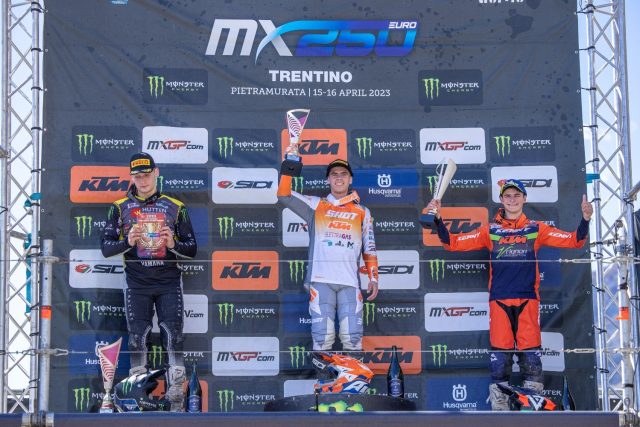 Giornata memorabile per il Motocross italiano e per il progetto Pata Talenti Azzurri FMI. Il secondo appuntamento stagionale dell’Europeo Motocross 250cc disputatosi al Crossdromo “Il Ciclamino” di Pietramurata in Arco di Trento ha visto tre giovani piloti supportati dalla Federazione Motociclistica Italiana e da Pata Snack monopolizzare il podio. Valerio Lata, Andrea Bonacorsi e Ferruccio Zanchi, con quest’ordine, hanno concluso ai primi tre posti dell’EMX250, il tutto in un fine settimana impreziosito dalla prima affermazione in un Gran Premio del Mondiale Motocross MX2 di Andrea Adamo, prodotto del progetto Pata Talenti Azzurri FMI.