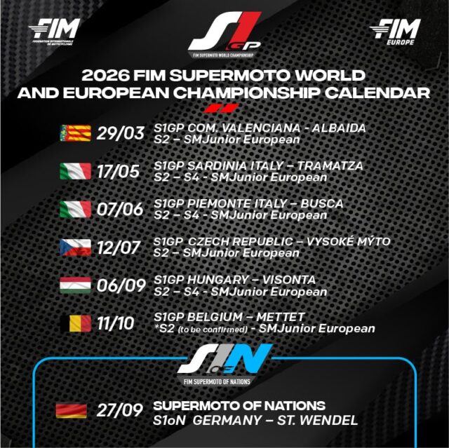 a FIM, la FIM Europe e XIEM hanno presentato il calendario provvisorio del Campionato Mondiale ed Europeo Supermoto 2026, che prevede sei round oltre al prestigioso appuntamento del FIM Supermoto of Nations.