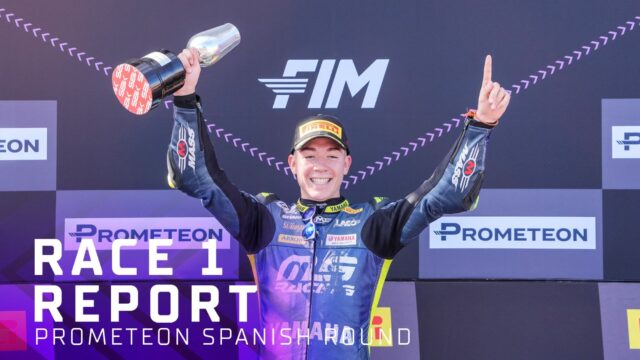 David Salvador (MS Racing) conquista la sua prima vittoria nel Campionato del Mondo FIM Supersport 300, trionfando in Gara 1 del Round Prometeon di Spagna al Circuito de Jerez – Angel Nieto con un margine di soli tre millesimi su Julio Garcia (KOVE Racing Team). Aldi Mahendra (Team BrCorse), leader della classifica, chiude terzo, mentre Loris Veneman (MTM Kawasaki) viene retrocesso al sesto posto per guida irresponsabile.