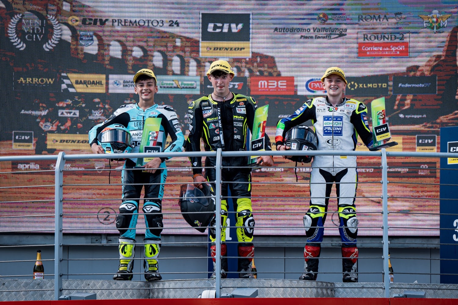 Il podio tutto Pata Talenti Azzurri FMI di Gara 1 del Dunlop CIV PreMoto3 a Vallelunga con Cristian Borrelli, Edoardo Savino e Gionata Barbagallo.