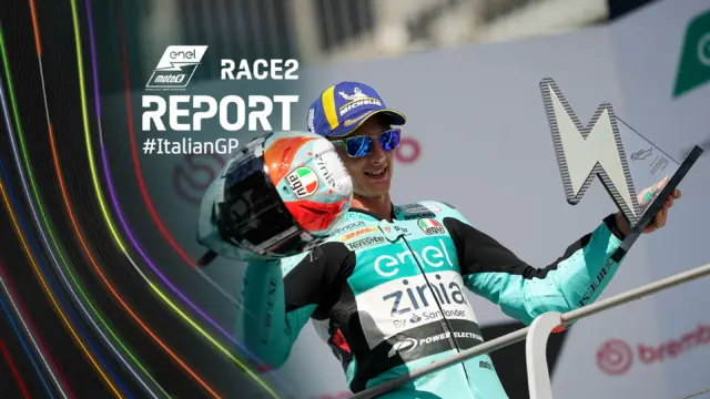 La Gara Alla partenza della MotoE™ Race 2 del Gran Premio d’Italia Brembo, è stato Alessandro Zaccone (Tech3 E-Racing) a prendere il comando iniziale, prima che Zannoni lo superasse rapidamente alla prima curva. Zannoni ha subito impresso un ritmo forsennato, cercando di staccare il gruppo compatto della MotoE™.